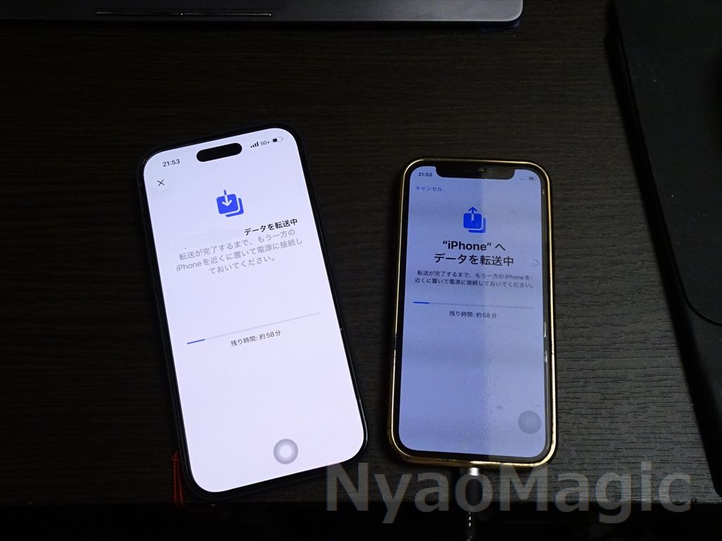 いや、いくら何でも10分でデータ送信が完了することはありえない。一方、iPhone Airには5G表示が出て、使える状態になっている。iPhone Airは「こんにちは」の画面になっているので処理を開始すると先ほどと同様に再びクイックスタートのアナウンスが表示された。そのため、改めてiPhone12mini側をWifiにつないで認証を行い、再度クイックスタートを実行すると、今度はデータの転送が開始された。