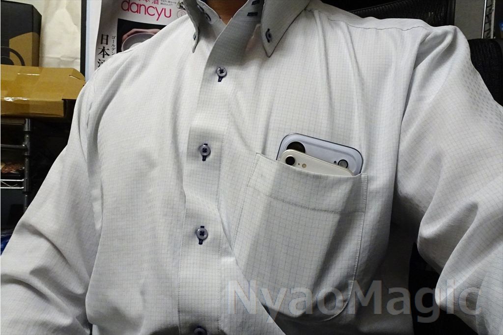ビジネスシャツの胸ポケットに社用のiPhone SE(第3世代)と2台同居できたのは想定外のメリットだった。持ち歩き前提なら、厚みが減ることの効果はあるといえる。