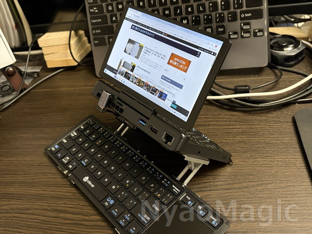 • スタンドをつけたところ、GPD MicroPC2の画面の回転機構のおかげで目に近づけやすく、7インチでも「入力環境さえ整えば、意外と作業できそう」という感触が出てきた。