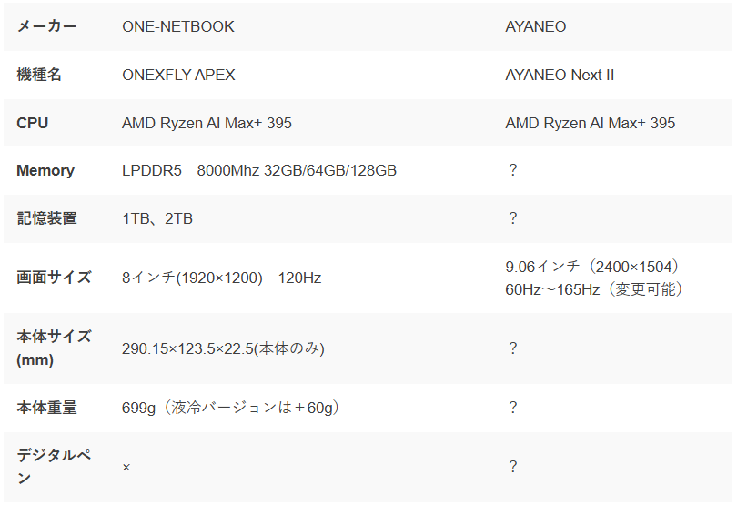 AYANEOでもRyzen AI Max+ 395を搭載したAYANEO NEXT 2が発表されている。詳細仕様や発売時期は不明だが、9インチのOLEDディスプレイを搭載予定とされる。こちらはGPDやOne Netbookと異なりバッテリーを内蔵する構成になるようだ。